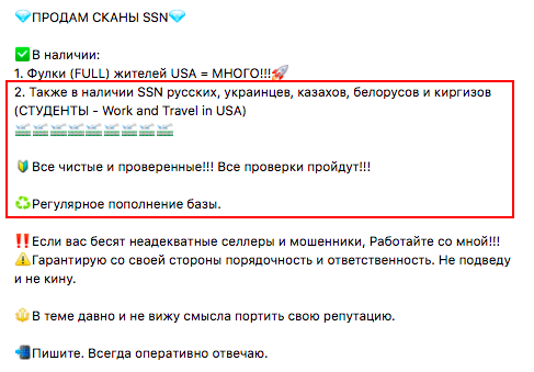 Русскоязычный интернет наводнен всевозможными предложениями о покупке / продаже SSN. Простой поиск в Интернете позволяет обнаружить десятки объявлений, форумов и групп в социальных сетях, полностью посвященных продаже / покупке SSN бывших участников WaT. По сути -это черный рынок личных документов участников WaT. Обычное объявление выглядит что-то вроде этого: “Продаю SSN (сканированные, без физических карт) студентов J1, которые в настоящее время не находятся в США. Комплект: копия SSN и виза. Номера чистые, мошенничества нет, продажа одной рукой. Кому интересно – пишите мне. Не консультирую, только продажа” [194, ssn_2]. Примерно так реализуются номера участников WaT на черном рынке. Может среди них и ваш и наш номер, никто не знает точно, кого слили агенты.