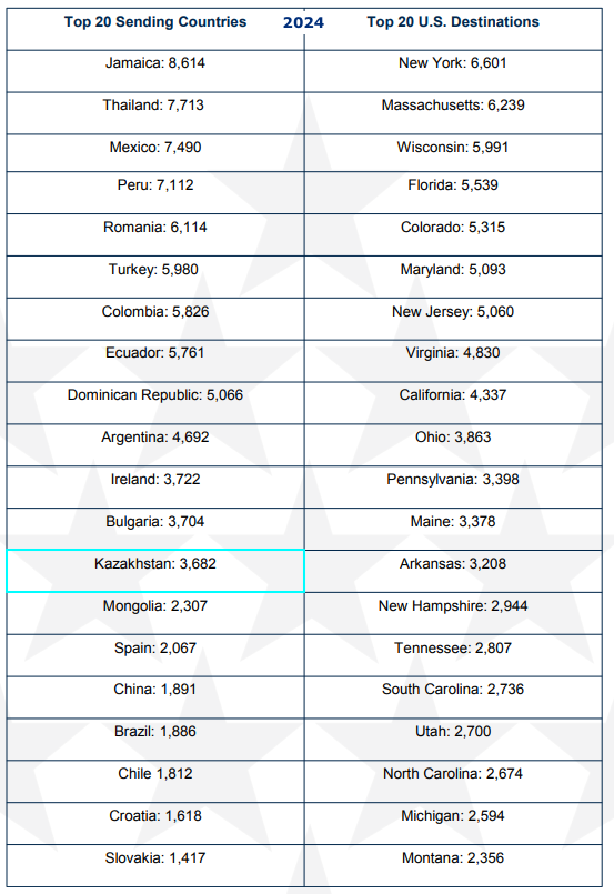 Рисунок 2.2.6. 20 основных стран (слева) и 20 основных принимающих штатов (справа) участников программы Work and Travel Usa, 2024. Источник: госдеп сша [249]