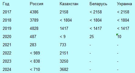 Рисунок 2.3. Количество участников программы Work and Travel Usa из России, Казахстана, Белоруссии, Украины, 2017-2024. Источник: госдеп сша [249]