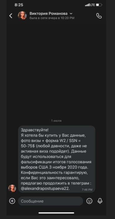 At first encounter, I did not pay attention to it, but the frequency of these occurrences have steadily increased 3-4 months leading to November 2020. Another peculiarity bothered me more – only students who have participated in the swt program were being contacted and offered to sell their personal data (SSN, W-2, visa data, etc.) to “falsify” US Presidential elections. Such clearly observable trend has spiked my interest – it is an indication of organized dump of the swt participants’ data. It looks like someone who has a list of swt program participants shared it with scammers who would use it for US voter fraud.